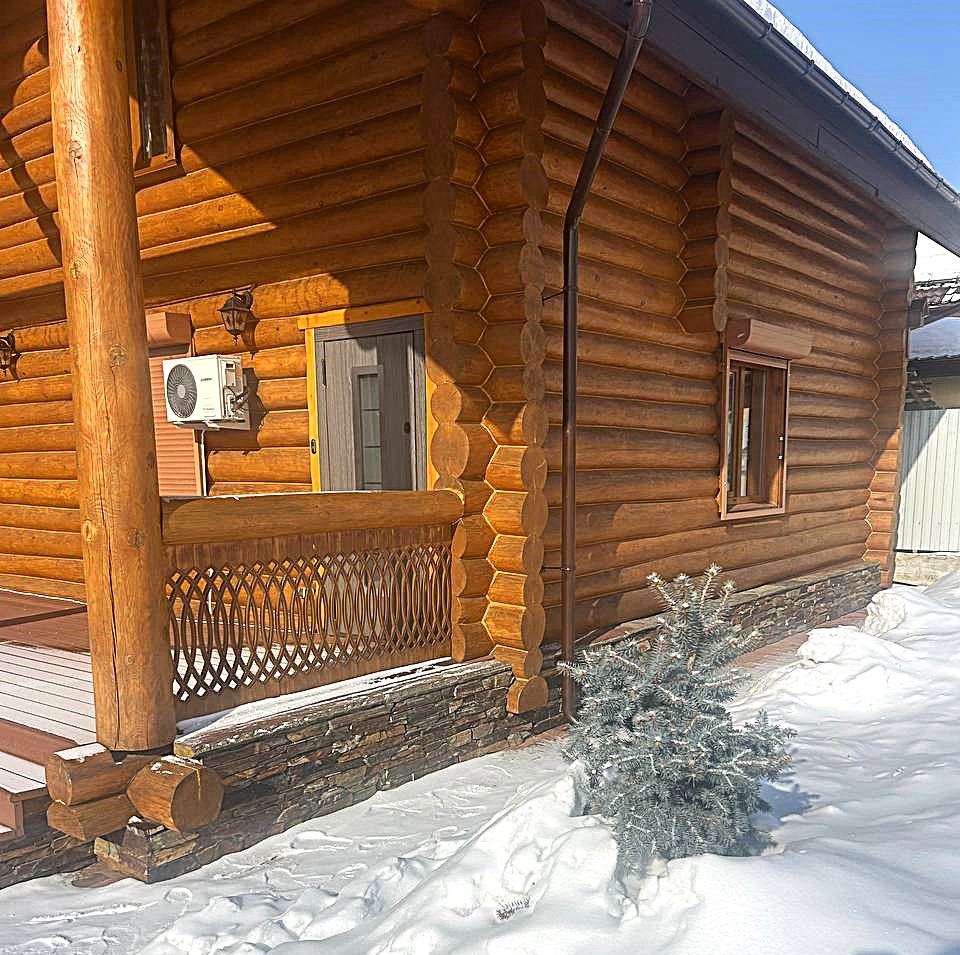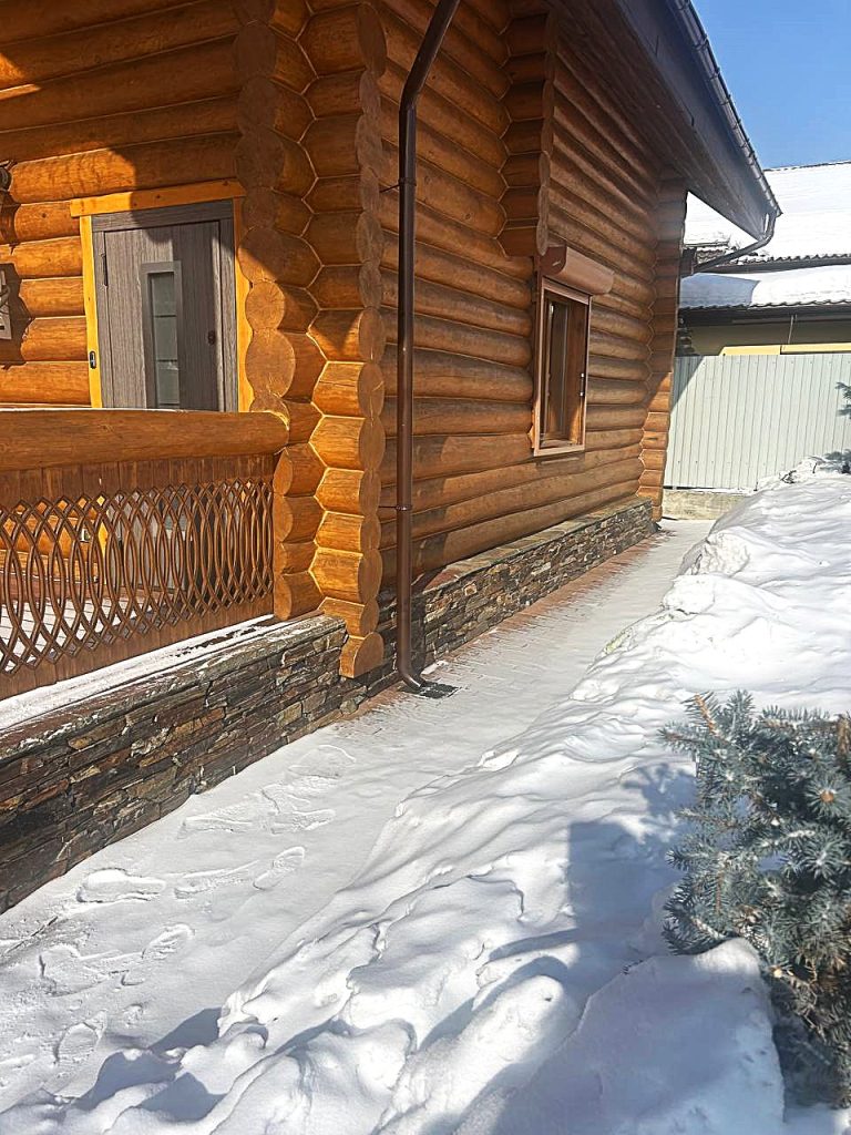 В массе камень имеет холодную палитру голубых и серых оттенков и неповторимый мягкий рельеф с вкраплениями зеленоватой патины. Несмотря на массивные размеры, смотрится легко, особенно в интерьерах бревенчатых домов.